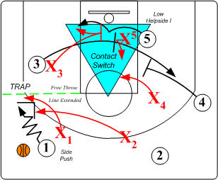 Sideline Trap. Defensive player X1 pushes the point guard O1 to sideline checkpoint. Defensive player X2 traps O1 with X1 above the free throw line extended. X3, after executing a contact pivot switch with X5, Fronts the post O5. X5 forces O5 low along the baseline,and then makes a contact switch with X3. X4 and X5 assume Helpside Triangle "I" positions ready to rotate to O2 or O3 on O1's pass.