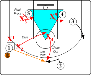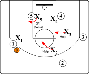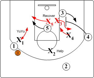 Defensive player X5 plays O5 straight up attempting to force O5 away from the basket and into a turn around jump shot. Weakside defenders X2, X3, and X4 pack it in (help) in attempt to help out on O5. When O1 passes to post O5, O1 can "Yo-Yo" back and forth attempting to help out on O5. When O5 passes back to O1 spotting up, X1 recovers back to O1.