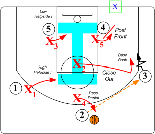 When O2 makes a pass to O3 on wing, X2 closes out to O3 pushing O3 to corner checkpoint. X5 fronts the post O4 while X1 and X3 drop into Helpside "I" positions against O1 and O5. X4 assumes a pass denial position against O2 creating box pressure by preventing the ball reversal pass. When matched up, basic SOS defensive principles are in effect.