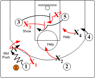 Defensive player X1 forces the point guard O1 to middle and pressures pass to post O5 . Defensive player X2 steps out hard (SHOWS), and forcing O5 to come wide off O2's base screen. X5 trails over the screen assuming 3/4 side or FRONT position against O5. X3 and X4 drop into weakside help position to congest the post areas.
