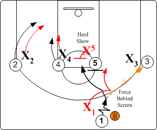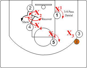 On the weakside, defender X4 "SHOWS and RECOVERS" against O4's down screen while defender X2 chases out. Matching up, defender X3 applies ball pressure and smothers O3. X1 assumes a defensive post position against O1, pushing O1 off the block. X2, X4, and X5 "Pack It In."