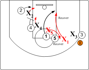 Defender X1 catches up and assumes a 3/4 pass denial position against O1 in low post area. X5 recovers back to a pass denial position against O5. The weakside defenders will also "pack in" (drop off) to congest the basket area.