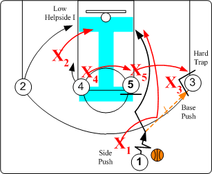 When wing O3 receives the ball, X3 assumes an on Ball Set position forcing O3 to the baseline checkpoint. X5 takes a pass denial position against high post O5. When O1 passes to O3, X5 releases out and double teams O3 with X3 on the wing. X4 in the high Helpside I position rotates over on trap into a pass denial position against O5. X2 assumes a low Helpside I position anticipating a pass out of the trap.