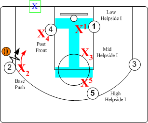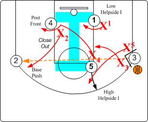 When O3 passes cross court to open O2 all players rotate according to the near player concept. X2 closes out and assumes an on ball Set position pushing O2 toward the baseline checkpoint. X4 dives down to O4 and assumes a post front position. X5 rotates out of the trap and assumes a pass denial position against O5 on the high post. X3 moves to a mid Helpside I position, and X1 moves into the low Helpside I position.