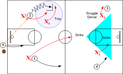 When O2 passes to O1, X1 closes out and pushes O1 to sideline checkpoint. X3 closes out to O3 and assumes a SNUGGLE pass denial position. X5 assumes a low Helpside "I" position against O5. X4 drops into a mid Helpside "I" position, and X2 takes a SNUGGLE pass denial position against O2, preventing any return pass to O2.