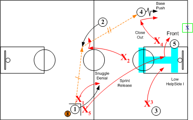 If O2 passes ahead to O4, X4 assumes a SET position and pushes O4 to corner or baseline checkpoint. X5 FRONTS O5 in low post area. X2 creates "Box Pressure" by assuming a Snuggle pass denial position on O2. X1 and X3 take Helpside "I" positions.