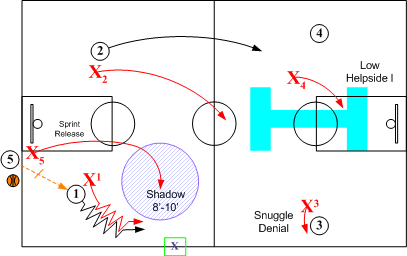 Note: when any time the shadow player X5 is unable to get into proper position, Shadow pressure is off and basic half court oriented SOS rules apply. Also, on any deep outlet or outlet into the middle of the floor, Shadow pressure is not feasible, and basic transition pressure defense is in effect.