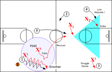 If O2 passes ahead to O4, X4 assumes a SET position and pushes O4 to corner or baseline checkpoint. X5 FRONTS O5 in low post area. X2 creates "Box Pressure" by assuming a Snuggle pass denial position on O2. X1 and X3 take Helpside "I" positions.