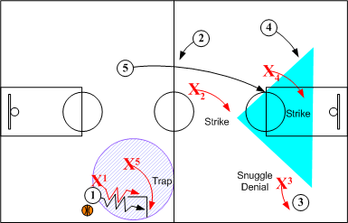With X5 in a support "Shadow" position, X1 applies extreme pressure on ball hanlder O1, forcing O1 to near sideline checkpoint. X3 maintains a SNUGGLE position on O3 while X2 and X4 rotate into Helpside "I" positions. Near mid court X5 fakes trapping O1 and releases back to a SNUGGLE denial position on O5.