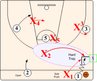 Hard Trap. Defensive player X1 pressures 3/4 court and forces dribbler O1 toward sideline checkpoint. X2 rotates over from baseline side and traps dribbler O1 with X1. X3 assumes a SNUGGLE denial position on O3. Defender X4 moves into to a Low Triangle "I" position to deny any long lob pass to O4. X5 assumes a High Triangle "I" SNUGGLE position denying any pass to O5.