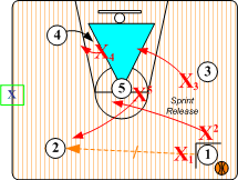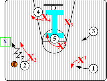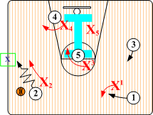 Final Match Ups. Defender X2 pushes O2 to corner or baseline checkpoint. X4 assumes an aggressive low post fronting position against O4, defenders X1 and X3 maintain contact SNUGGLE denials on O1 and O5 While X5 assumes a Helpside "I" position. All basic SOS rules are in effect and rotate according to O2 actions. If O2 penetrates to the free throw line extended, "Base Go I" or "Base Go Red" rotations are initiated (coaches decision). If O2 feeds low post O4, "Post Front" trap rotations take place. |