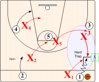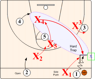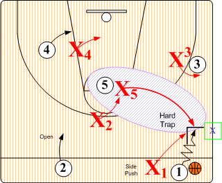 Hard Trap. In SOS "Red Rover 5" half court disruption, designated defender X5 steps out and traps the ball handler with X1. X2 assumes a High Triangle "I" SNUGGLE position denying any pass to O5. Defender X4 moves into to a Low Triangle "I" position to deny any long lob pass to O4. X3 assumes a SNUGGLE denial position on O3.