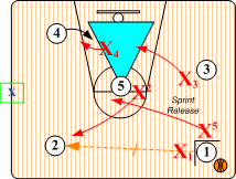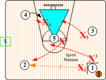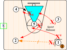 In these aggressive SOS half court disruptions, the ballhandler is trapped in the front court area near the sideline hash mark. As in the "Base Go Red" baseline trap scenario, the non-trapping players form a Triangle I. When a pass is made out of the mid court trap, as the ball leaves the passer's hands SOS "Near Player" rotations occur. SOS mid court disruptions end in either "Base Go Red" or "Base Go I" which is predetermined by the coach.