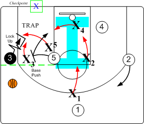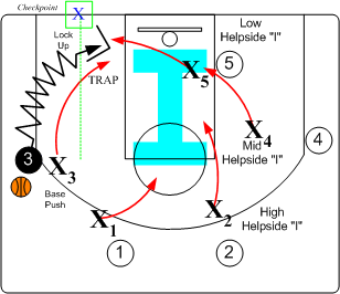 When the ball reaches the area of the free throw line extended, the defender on the ball pushes the offensive player toward the corner or to the baseline checkpoint. If the offensive player penetrates on the dribble inside the base checkpoint, an automatic trap takes place with the low "Helpdside I" defender quickly stepping out to "Lock Up" on a baseline trap. Other three defenders rotate into a Triangle I with all of the SOS "near man" defensive rules in effect.