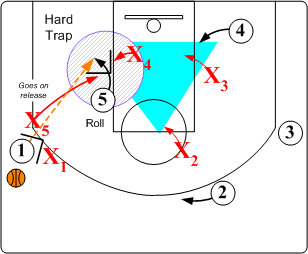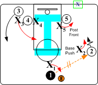 If O1 passes to O5 on base roll, X5 releases on pass forcing O5 to baseline. X4 comes along baseline to trap O5 with X5. X3 and X2 maintain Helpside "I" positions ready to closeout to O2 or O3.