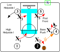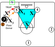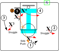 When O3 makes a pass out of the trap into O5 posting up, X5 immediately releases and double teams O5 with X4. Defender X3 assumes a snuggle denial position on O3. X2 and X1 maintain their Helpside I positions. |