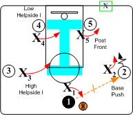 The on the ball defender pushes the offensive player toward the corner or to the baseline checkpoint with all basic SOS rules are in effect. The low Helpside I defender is ready to trap ballhandler on any baseline dribbble penetration inside the baseline checkpoint. Note: prior to any penetration inside the baseline checkpoint, the low Helpside defender can disconcert the ballhander by showing (faking a trap) and recovering back into position once the dribbler picks up the dribble.