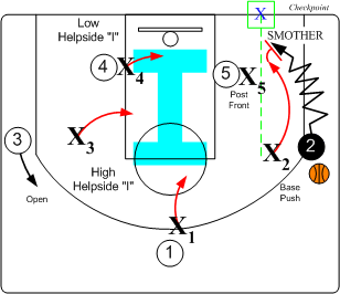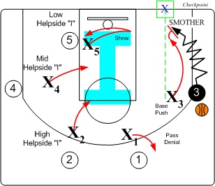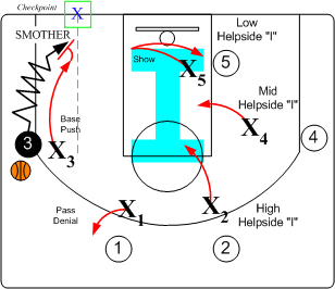 When wing O2 receives a pass or dribbles the ball below the free throw line extended area, defender X2 pushes O2 to baseline checkpoint. When O2 stops dribble penetration or picks up the dribble prior to the baseline checkpoint, defender X2 assumes a hard "smother" position by crowding O3 with both hands up exerting maximum pressure on the shot or pass. All basic SOS rules are in effect.