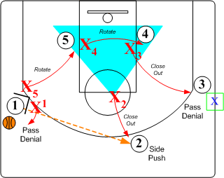 When O3 passes the ball out to O1, X1 closes out quickly to O1, pushing O1 toward sideline checkpoint. X2 closes out to a pass denial position against open O2. X5 rotates to low post O5. X4 rotates back to O4 and X3 assumes a snuggle denial position against O3. |