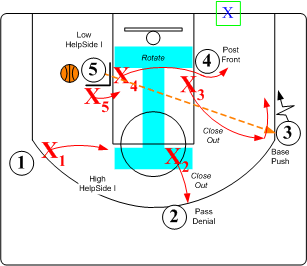Defenders rotate according to O3's actions. If O3 drives base, "Base Go I" or at the coach's discretion, "Base Go Red" scenarios are in effect. If O3 passes over X4's post front, X5 covers and traps O4 with X4 while X1 drops to Low Helpside "I" positon and X2 moves to a Top Helpside "I" position. If screening game is initiated, basic SOS defensive rules are in effect.