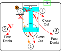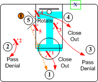 Defender X5 assumes a 3/4 pass denial position against the post O5. When the wing, O2, passes inside to O5 posting up, defenders X1, X2 and X3 assume pass denial positions against O1, O2 and O3, and aggressive deny any kick out pass from the offensive post.