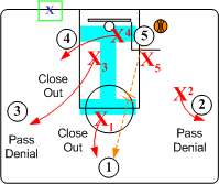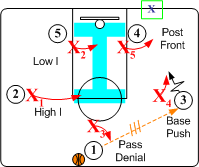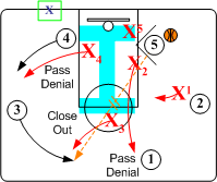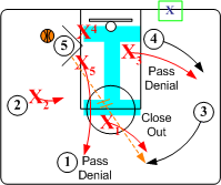 Pass OutWhen O5 passes the ball out of the double team back to O2, X2 quickly closes out to O2, pushing O2 toward the baseline checkpoint. Defenders X3 and X4 assume Helpside I positions while X1 maintains a pass denial position on O1 creating "Box Pressure" by preventing a ball reversal pass to O1. When matched up all of the basic defensive fundamentals apply. |