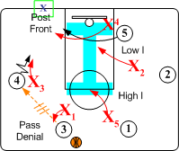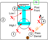 Post defender X5 pushes O5 out from the block area and then assumes a high side pass Denial SNUGGLE position in attempt to deflect or disrupt any pass into the low post.