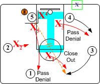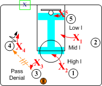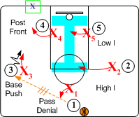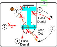 Post defender X5 pushes O5 out from the block area and then assumes a low side pass Denial SNUGGLE position in attempt to deflect or disrupt any pass into the low post.