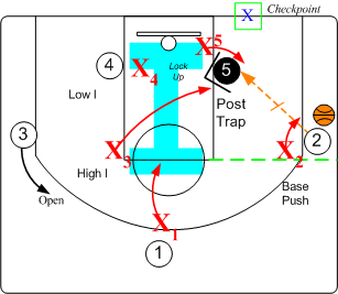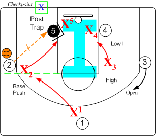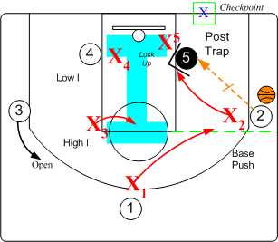 The Go Base post trap scenario is used most often for double teaming the offensive low post. It used whenever the offensive post player is moved off the low block area or on a coach's call in the deep low post area when a 3/4 high side post pass denial is utilized or the defensive player is late in fronting the post. Defensive player X2 crowds the passer O2 with both hands up exerting maximum pressure on the shot or pass while forcing O2 to baseline checkpoint. It is essential that the post defender turns the offensive post to the baseline on catch. The low Helpside I defender has backside "Lob Pass" responsibility, and quickly rotates along baseline to "Lock Up" the post in a hard double team on the release of the pass.