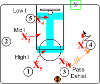 Wing YoYo - Right SideWhen a non-shooting wing O2 passes inside to O5 posting up, X2 has the option of sagging off and double teaming O5. X1, X2, and X3 assume aggressive pass denial positions denying any kick out passes from the post. |