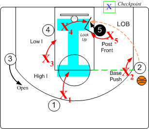 Low Helpside I defender double teams on post lobs and Base Go traps.