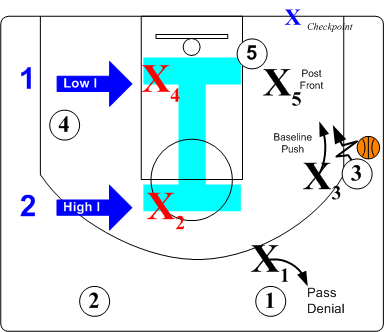 When the offensive teams deploys three players on the ball side of the court, a Double I Helpside defensive alignment is created . From this alignment two defensive players provide for strong defensive by forming a Low/High alignment.
