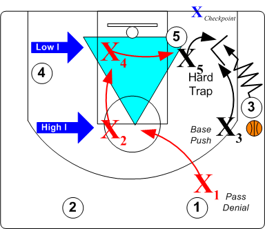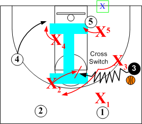 If/when the defender is unable to turn the dribbler and the dribbler penetrates to the free throw line area, the high I defender X2 makes a "Cross Switch" with on ball defender X3.