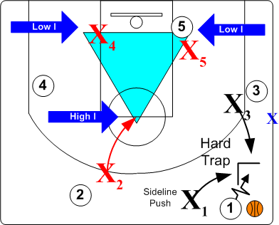 Weakside players assume a Helpside Triangle "I" alignment whenever traps are set. When a pass is made out of the trap, all players rotate as as ball leaves passers hands with player in High Helpside I position closing out to player receiving the pass. All other defenders rotate to nearest offensive player.