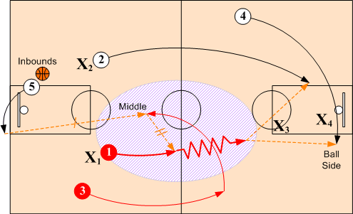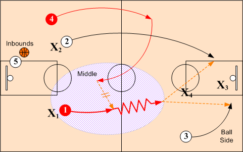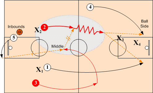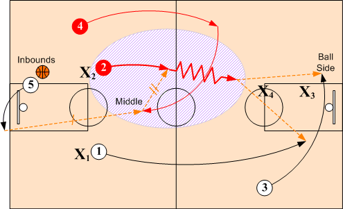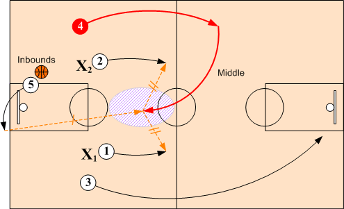 When defenders X1 and X2 overplay and deny the short inbounds pass to O1 and O2, O4 doubles back and breaks into the middle for inbounds pass from O5. O1 and O2 then release and sprint towards the basket looking for a feed from O4. O3 assumes a baseline position on ball side.
