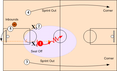 When defenders X1 and X2 overplay and deny the short inbounds pass to O1 and O2, inbounder O5 looks long to O3 to O4. If O3 or O4 do not receive the long inbounds pass, they continue to the corners clearing out any backside help. O1 seals off defender X1 and O5 makes an "Over the Top" inbounds pass to O1.