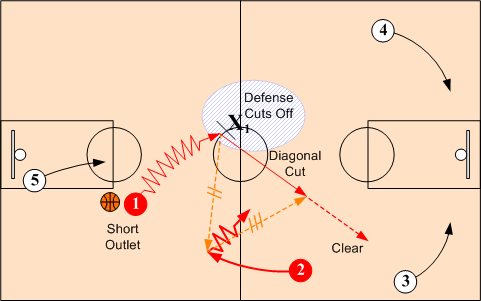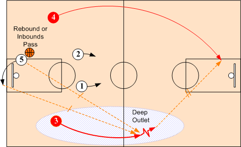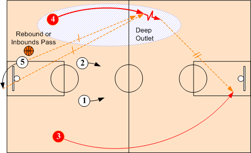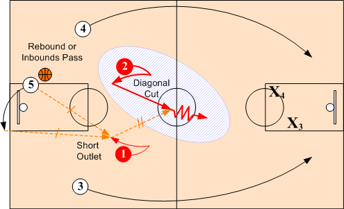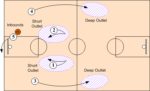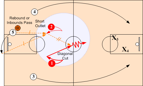 When shot is made (or a missed shot is rebounded), the passer quickly looks to throw a long pass to either O3 or O4. If not available, the passer then looks short to either O1 or O2. All passes must be sharp and lead receivers. Whenever possible advance the ball with pass rather than dribble. ( Note: O1 and O2 as well as O4 and O5 are interchangeable positions.)