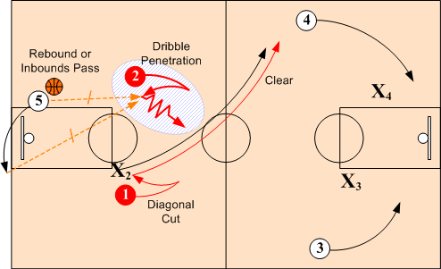 If O1 gets pressured by X1 or is double teamed, O2 pops back out to help. O1 passes back to O2 and makes a diagonal cut. O2 looks first to feed O1 on diagonal cut, and then to advance the ball on dribble into early offense.