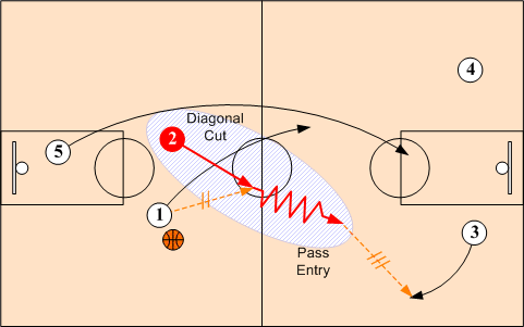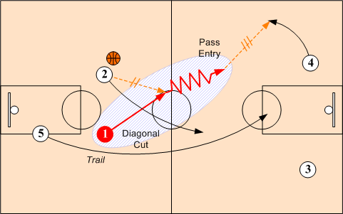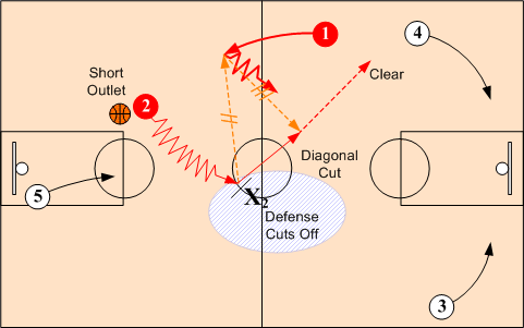 When O2 cannot feed O1 on diagonal cut, O2 advances the ball on the dribble. When O1 does not receive a pass from O2, O1 continues to the sideline ready to help out in case O2 runs into trouble or is double teamed. O3 and O4 turn out to wings or can cross under the basket if timing permits.