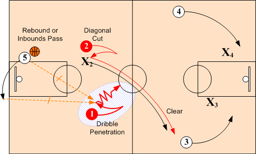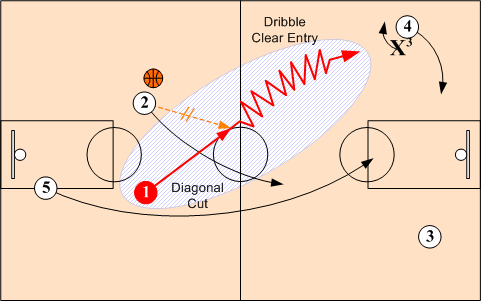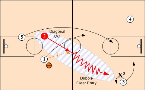 If wing O3 is overplayed, O3 back cuts to the basket and O2 executes a dribble clear entry into the early flow offense.