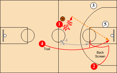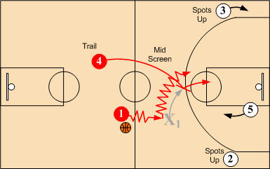 Mid ScreenTrail O4 initiates mid screen/roll action by executing an on ball screen on defender X1. O4 has option off popping out for shot rather than rolling to basket. |