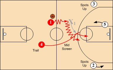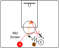 Mid Screen action is initiated by trailer O4 setting a mid screen for O1. The point guard has the options of turning the corner for a hard drive to the basket, a pull up jumper if the defense goes below O4's screen, feeding O4 rolling to basket when the defense switches or making a kick out pass to the shooter spotting up on the wing when their defender drops off to help out on O1's dribble penetration.