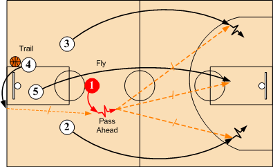 Basic action begins with a quick but safe outlet or inbounds pass to point O1 on the move. O1 immediately looks up the court to pass ahead to shooters O2 or O3 sprinting out on wings or to O5 flying down middle. When O1 cannot pass ahead, O1 advances the ball on a hard dribble. Shooters have green light to shoot any open shot since the defense is at a big rebounding disadvantage during transition.