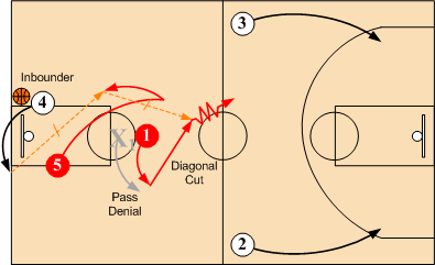 If/when the inbounds pass to point O1 is contested or doubled team, post O5 doubles back receiving the secondary inbounds pass from O4. O5 then looks to hit O1 on diagonal cut. O2 and O3 fill outside lanes while O4 and O5 trail.