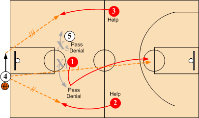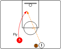 If/when both the primary and secondary receivers O1 and O5 are denied, wings O2 and O3 break back to help out. Point O1 breaks long and O4 looks to make a baseball pass to O1, leading O1 to opposite free throw circle. If the long pass to O1 is not available, O5 looks to inbound to O2 or after a made shot run along baseline and inbounds to O3. When O1 does not receive the long pass, O1 breaks to the sideline that the ball is inbounded looking for feed.