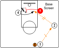 Base ScreenOn point O1's entry pass to wing, post O5 sets a base screen for O4. Wing looks to feed O4 coming off the base screen. |