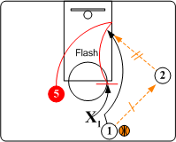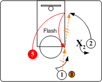 High Post Flash - Back CutWhen defender X2 overplays the wing entry pass to O2, post O5 breaks up to the free throw line looking for a pass from O1. O5 then looks to feed O2 on back door cut. If O2 is not open, O1 initiates two game action with O5. |