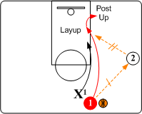 "Give & Go" CutWhen the defender X1 plays to the inside, the point can make an entry pass to wing and cuts to basket looking for return pass or post up. The give and go also can be executed by rubbing off high post screen. |