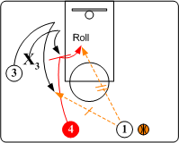 Down ScreenTrailer O4 sets a down screen on the weakside for O3 and rolls to basket. O1 looks to pass to O3 coming off the down screen or to feed O3 rolling to basket if the defense should switch, |