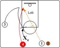 To initiate the weakside lob, O2 breaks up to the free throw line and sets a solid back screen for trailer O4. Point O1, after focusing the defense attention away from the back screen by faking an entry pass to O3, makes an over the top lob pass to O4.